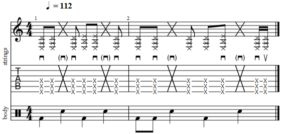 Once the Kick Drum Chord is comfortably performed, we can then play the 4/4 beat properly. It will also allow us to introduce some percussive drum like fills as transisions between rounds of chord progressions.