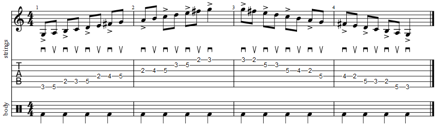 Once comfortable with the Kick Drum Chord, this version starts homing in on accuracy to be able to apply the technique for single note picking together with the deep percussion tone.
