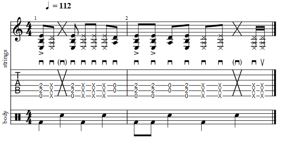 Once the Kick Drum Chord is comfortably performed, we can then play the 4/4 beat properly. It will also allow us to introduce some percussive drum like fills as transisions between rounds of chord progressions.